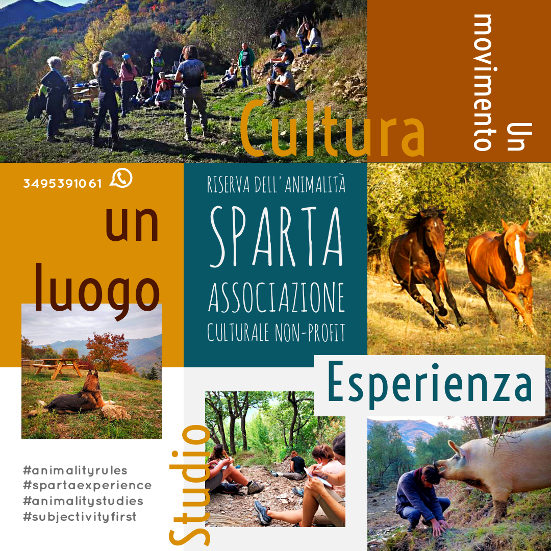 L’Associazione Sparta – Riserva dell’Animalità, che non ha fini di lucro, nasce con la volontà di imprimere un cambiamento di paradigma culturale, scientifico, sociale e pratico, da una conoscenza animale che opprime, ad una che libera, partendo da fondamenti di etologia antispecista, dove le coordinate di animalità, soggettività e cognizione animale, diventano riconoscibili, valorizzate, facilitate, agite e vissute all’interno delle dimensioni di convivenza degli umani con gli (altri) animali, ma anche per una nuova, più corretta, comprensione dei fenomeni naturali, ambientali ed eco-etologici in chiave antispecista, garantendo percorsi di studio, esperienza e promozione, che facilitino un dialogo con il mondo, basato sullo sviluppo di relazioni liberate ed emancipate da credenze, abitudini, pressioni e aspettative. Una realtà quindi che mette centrale una presa di coscienza, un’evoluzione di pensiero, ma anche e soprattutto una presa di contatto con la propria animalità e la logica animale che ne consegue, oltre che con importanti aspetti di benessere fisico e mentale.